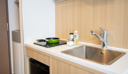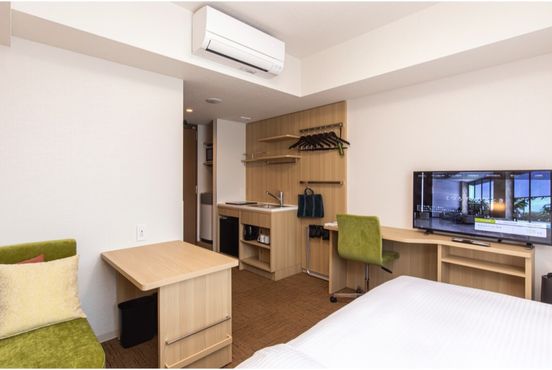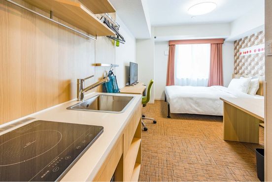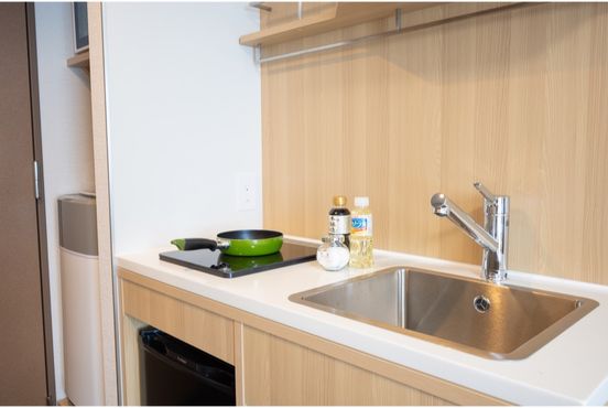 キッチン、洗濯機、レンジが備わっており、”暮らすように”ご滞在いただけるお部屋です。ミニソファとテーブルでお仕事でもレジャーでも快適にお過ごしいただけます。長期滞在や合宿などのご利用にもおすすめです。