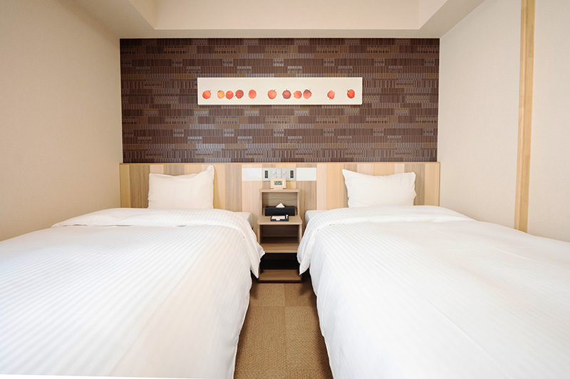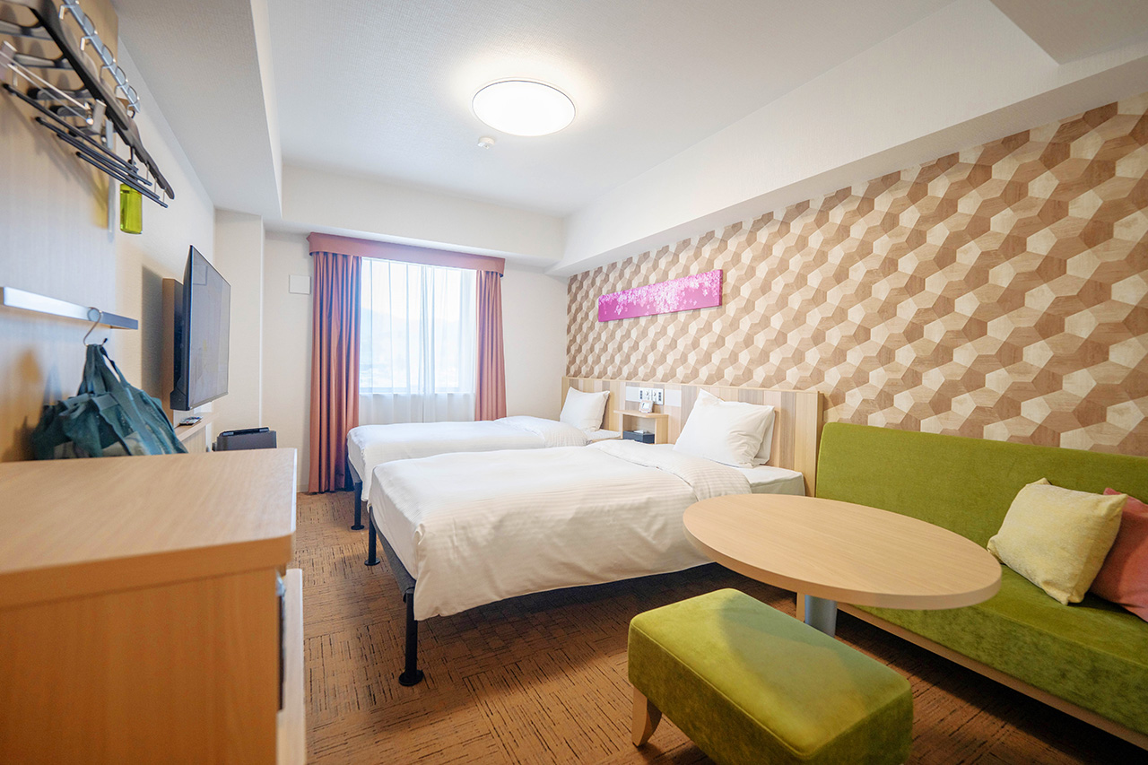 素足で過ごせる床材でゆったり広めのツインルームです。エキストラマットレスを使えば4名様までご宿泊可能です。心安らぐリラックスタイムをおたのしみください。
